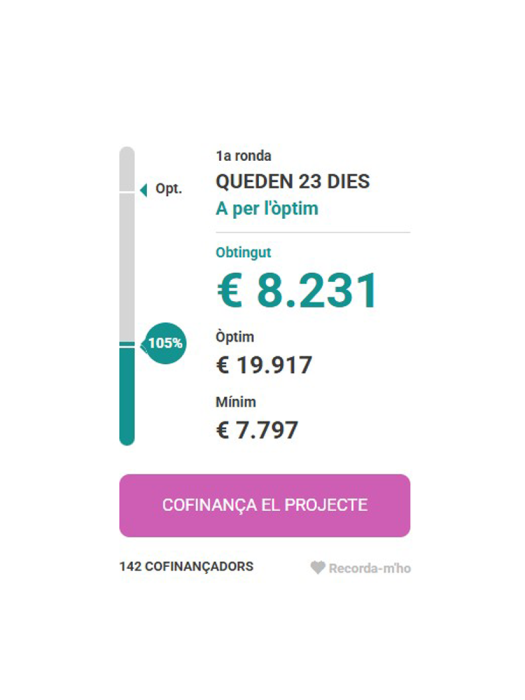 Haver arribat al mínim ens assegura que el projecte tira endavant, però encara ens queden 23 dies de campanya per intentar assolir l'objectiu òptim de 19.917 €. Aquest impuls extra ens permetrà millorar les instal·lacions i arrancar amb molta més força.